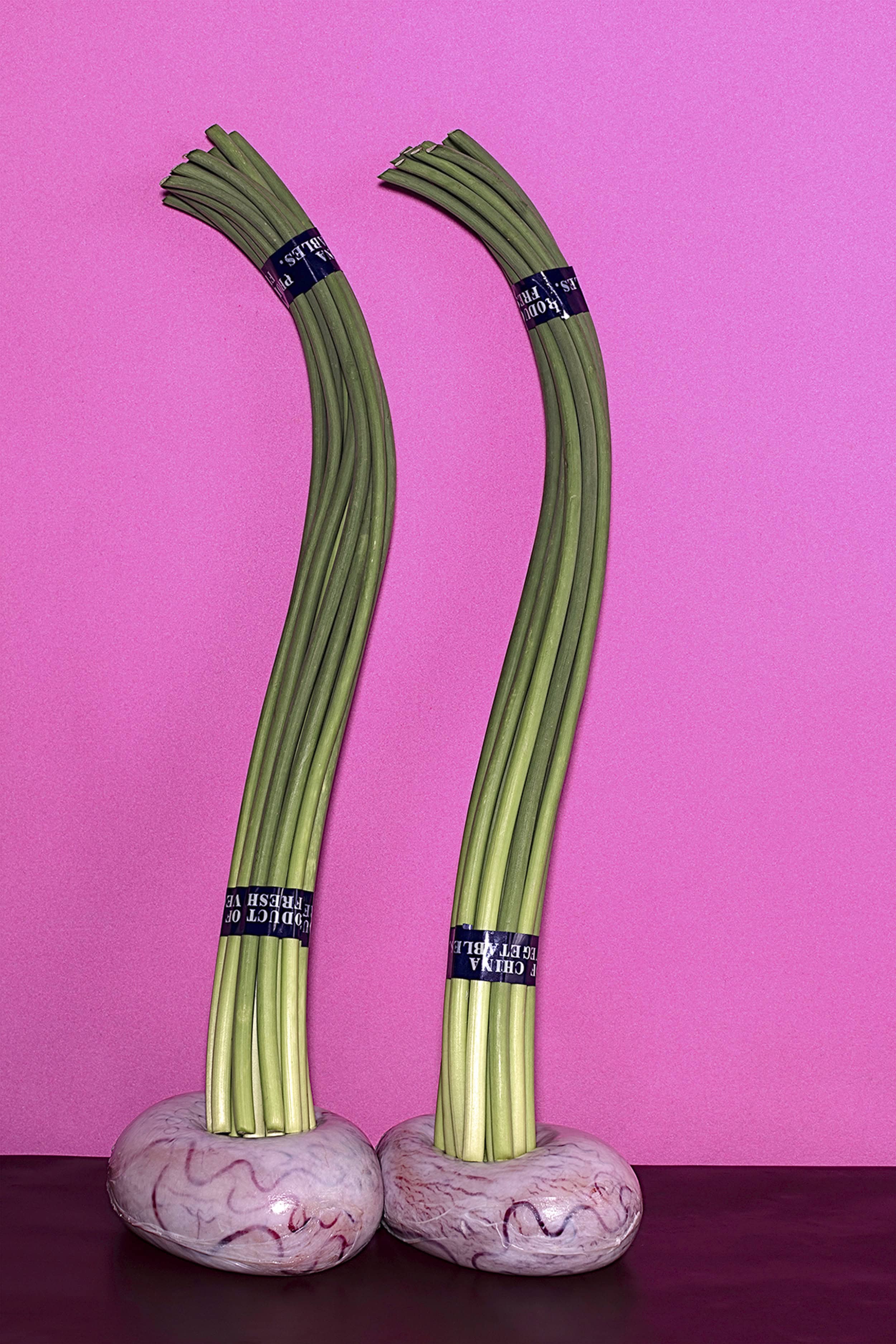 Her materials are gathered primarily from the aisles of grocery, hardware, or craft stores; venues where a seemingly endless array of objects co-exist, ready to be purchased, consumed, and discarded en masse, ordered only by what the artist calls “the detached pragmatism of consumerism.” Once these objects find a place in Bui’s studio, she parses their formal or material kinships and assembles them into temporary, fragile assemblages that sometimes exist just long enough to be photographed before they collapse, disintegrate, or even decompose.