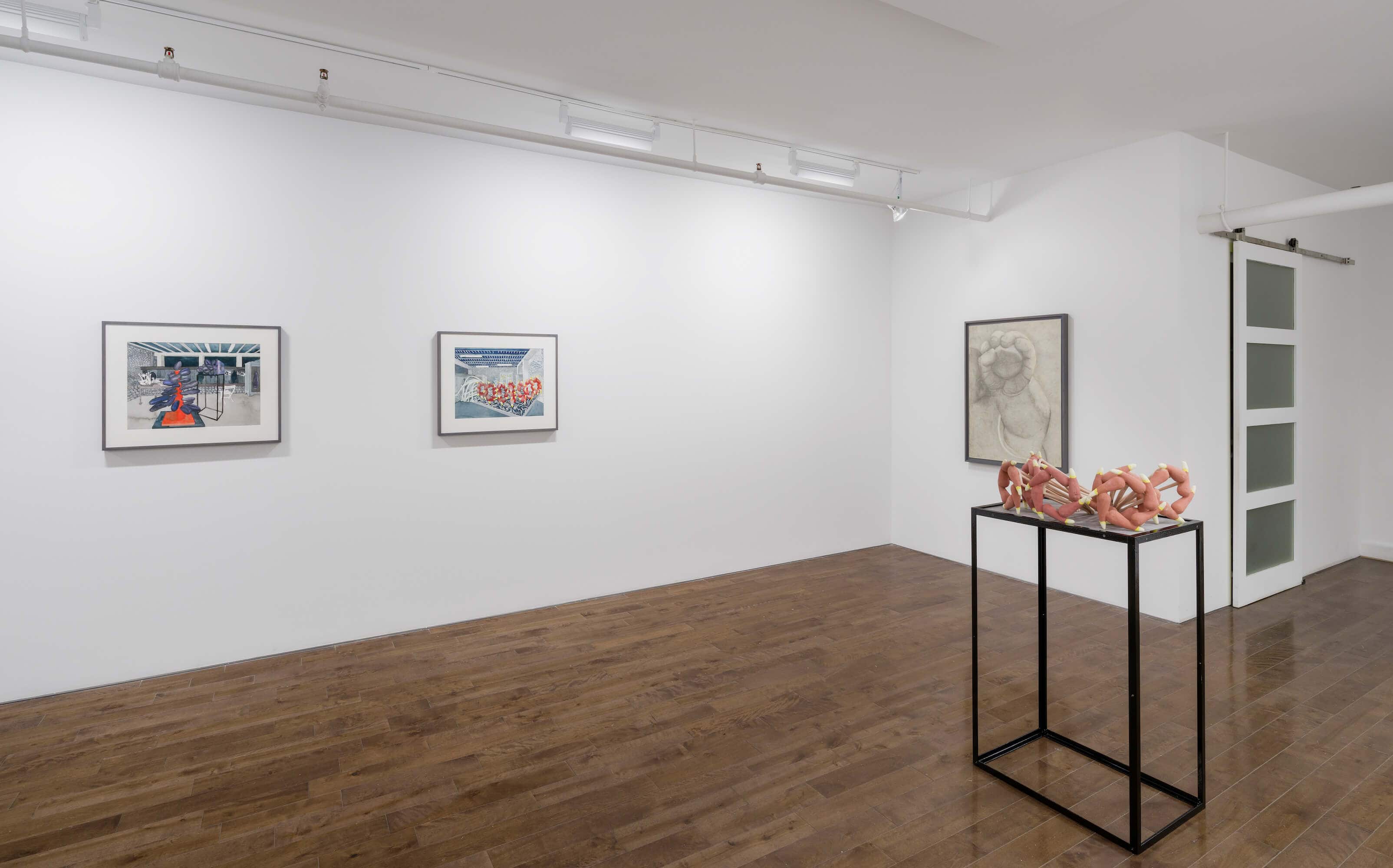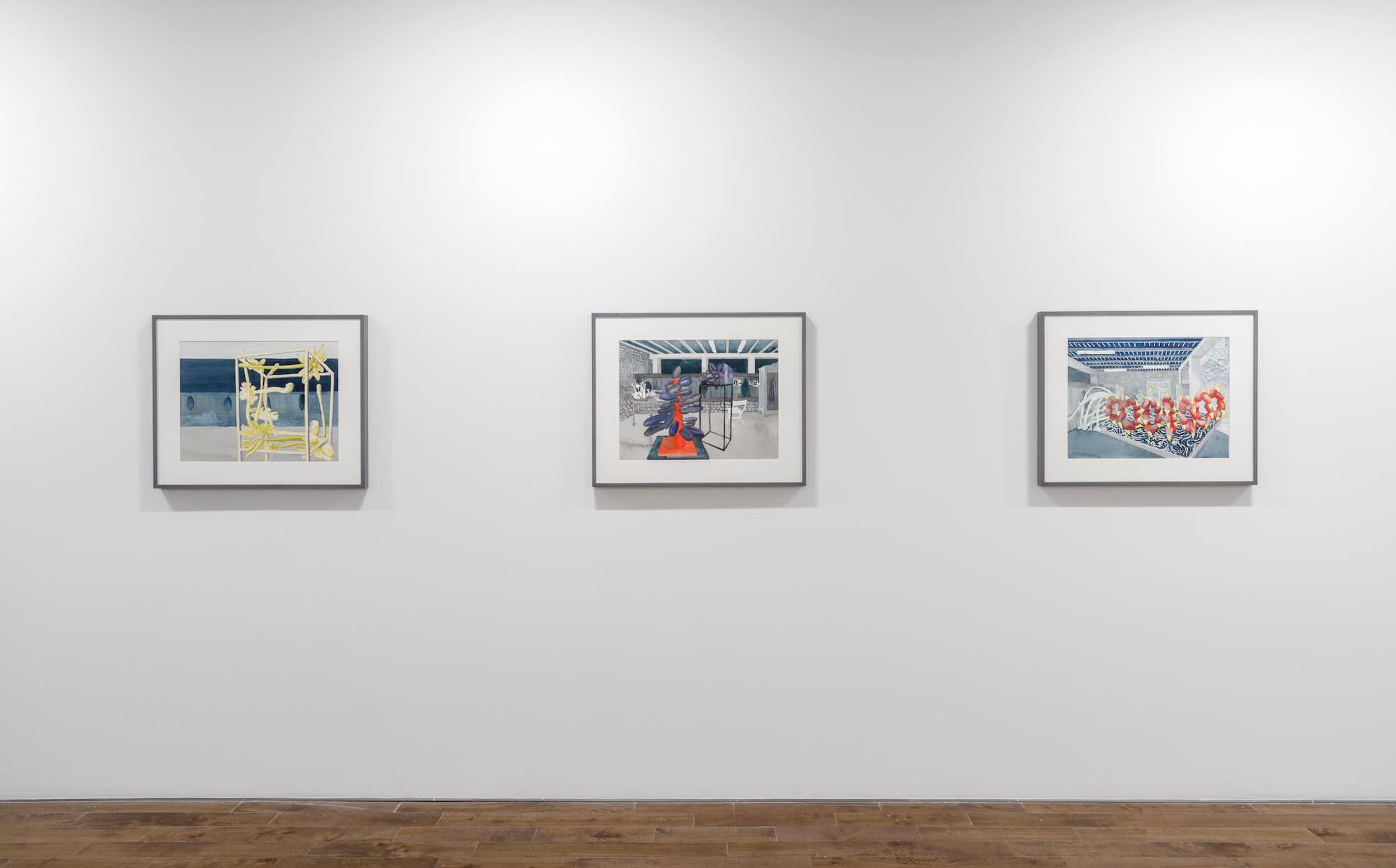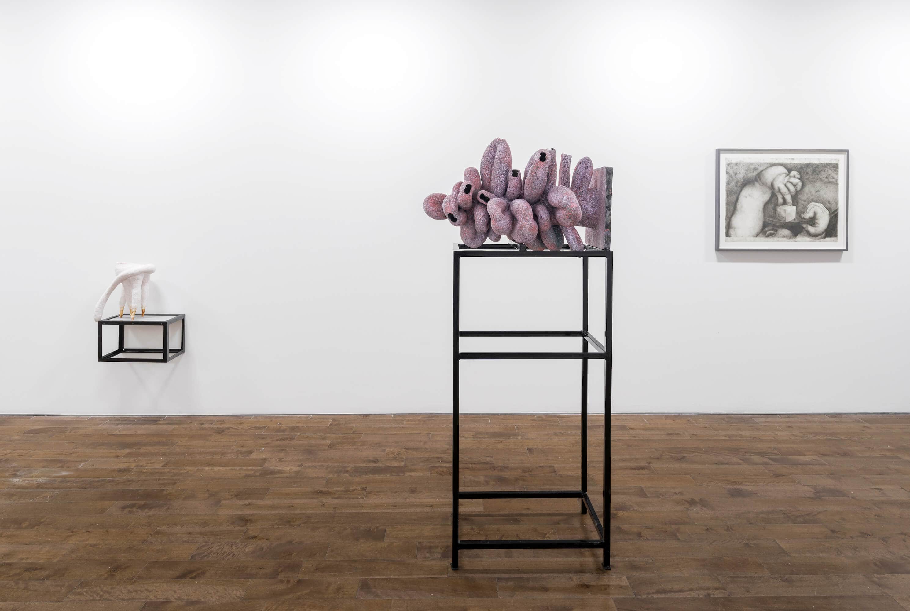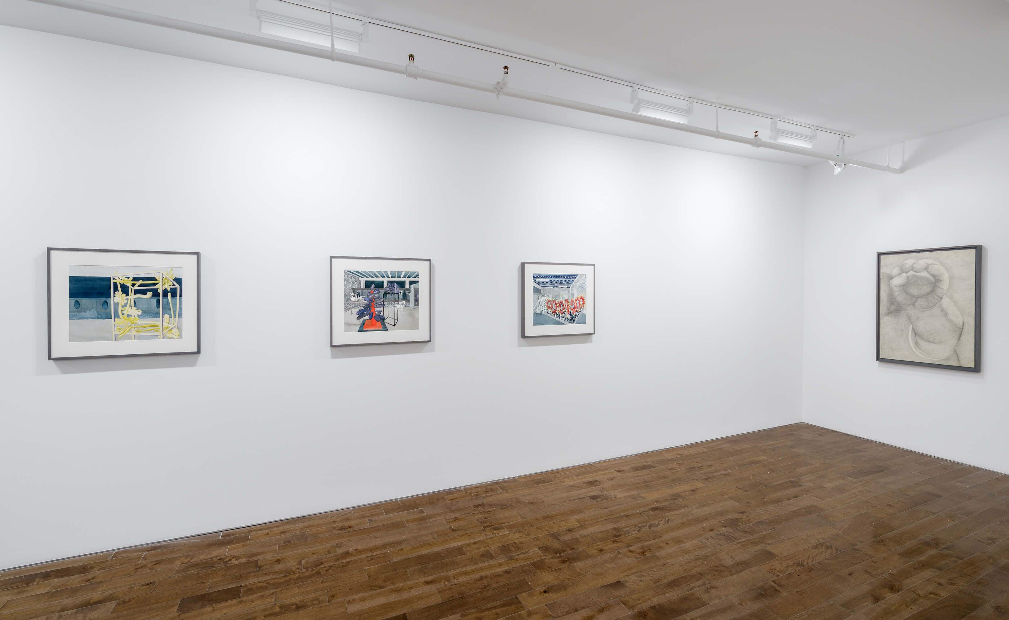 Quatre sculptures, qui peuvent être décrites simplement – une roue, une tasse, un paquet et un sac – sont représentées par des dessins à l’aquarelle. Ceux-ci voisinent des modelages de figures masculines dans l’atelier de l’artiste en France. Deux dessins au graphite d’il y a quarante ans représentent des mains de bébés saisissant leurs premiers instruments de joie, un cube et une balle, pour sonder et façonner leur environnement. Stephen Schofield nous a donné un bel aperçu de la façon dont les instruments peuvent changer notre milieu, de manière subtile, mais conséquente.
