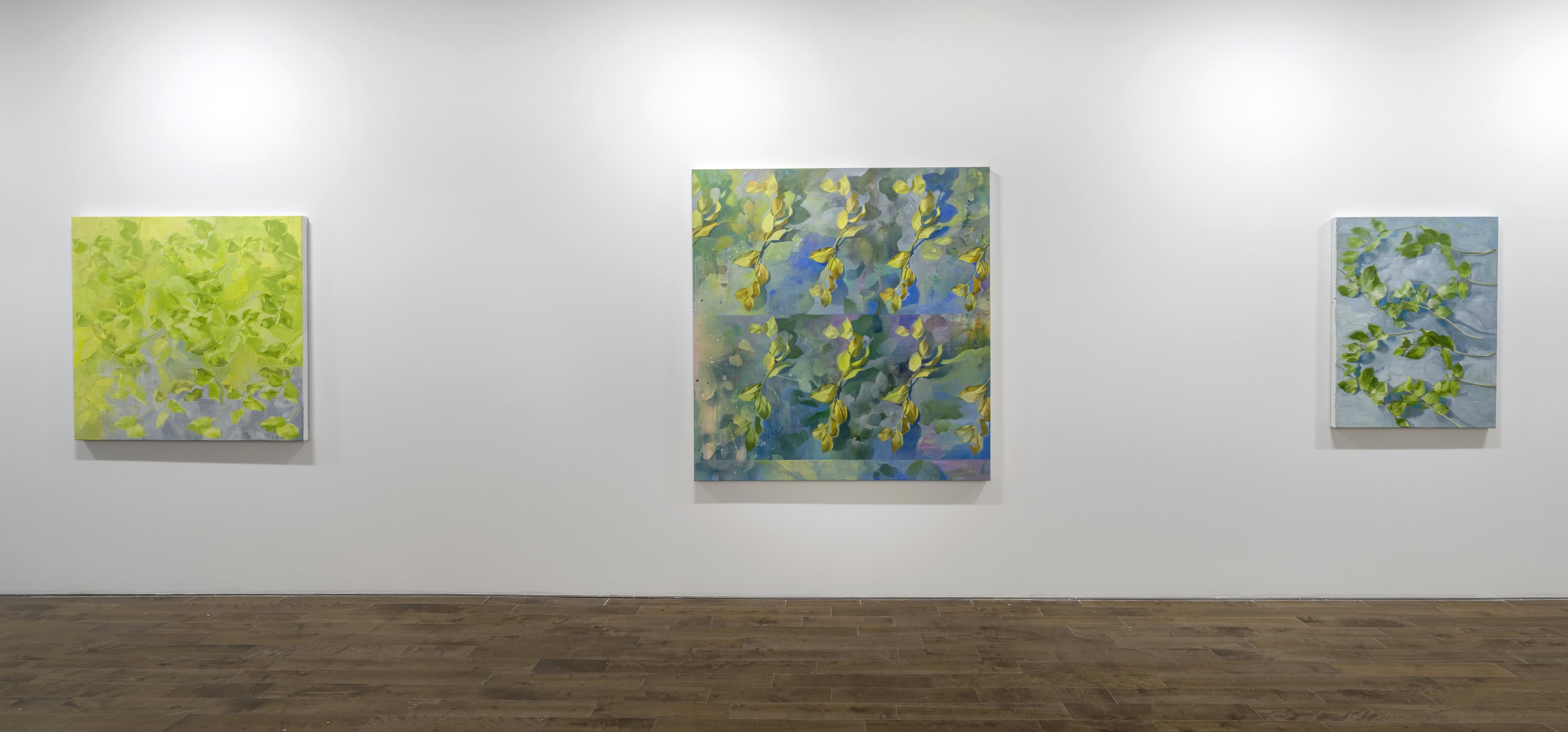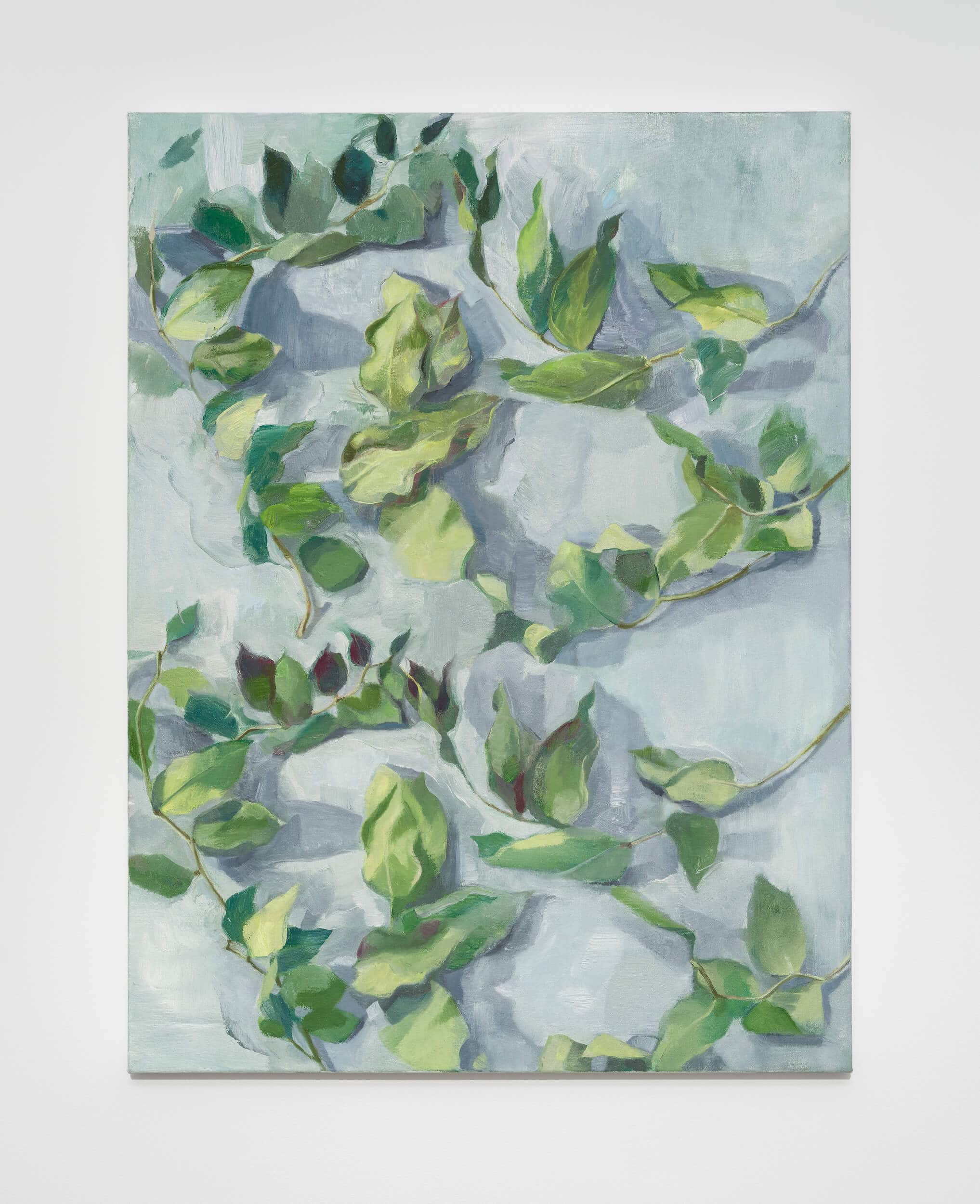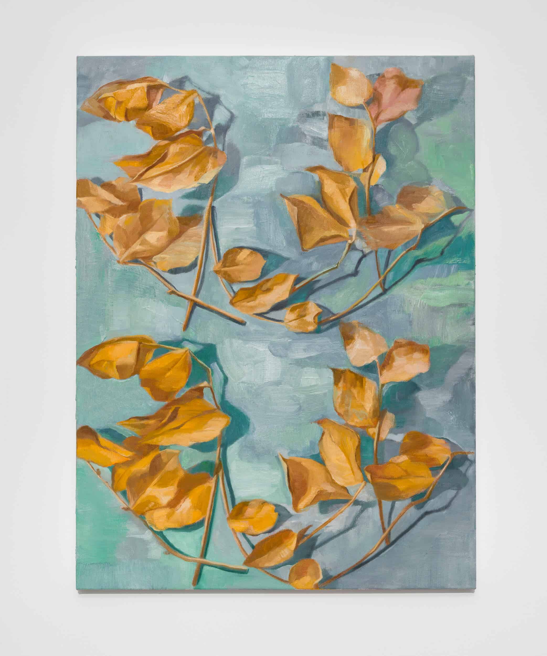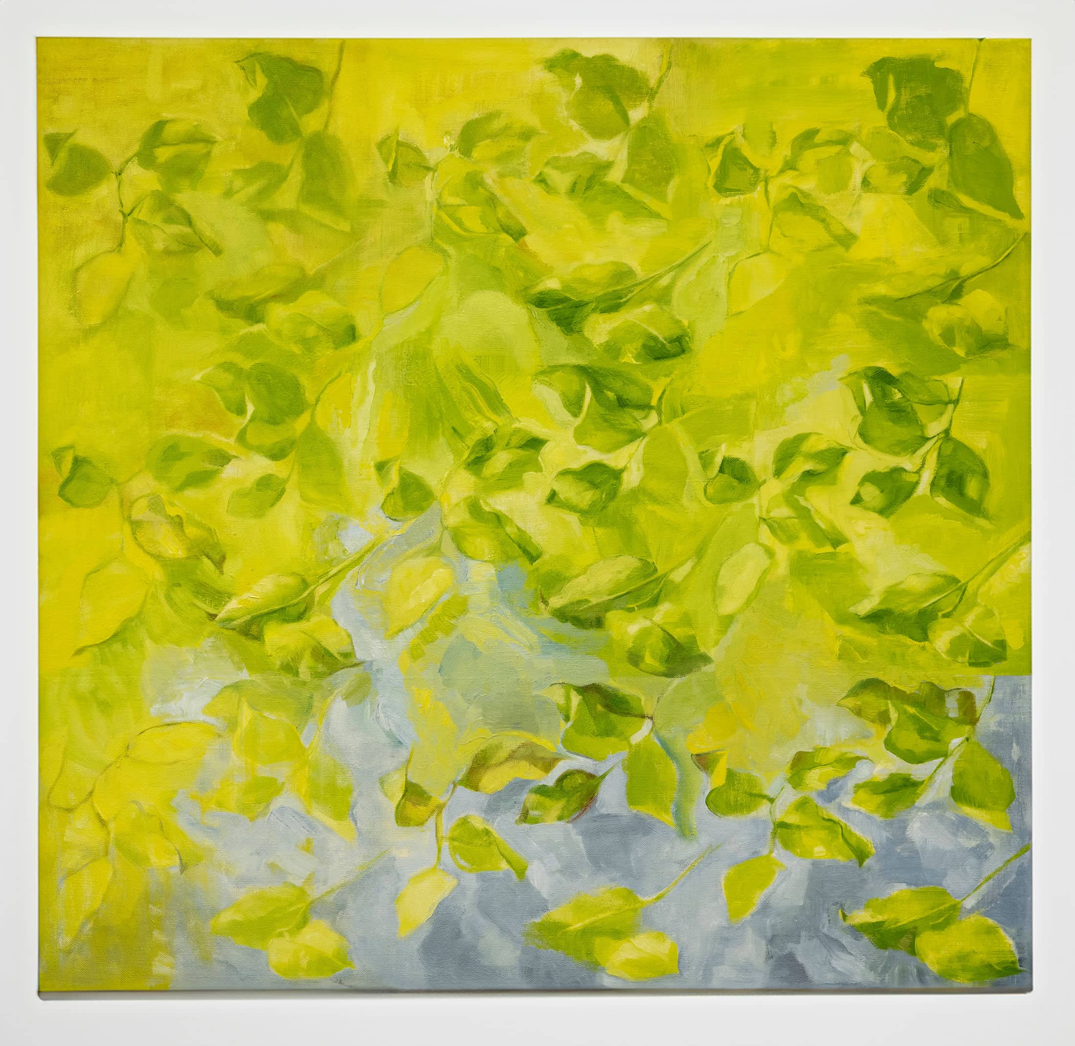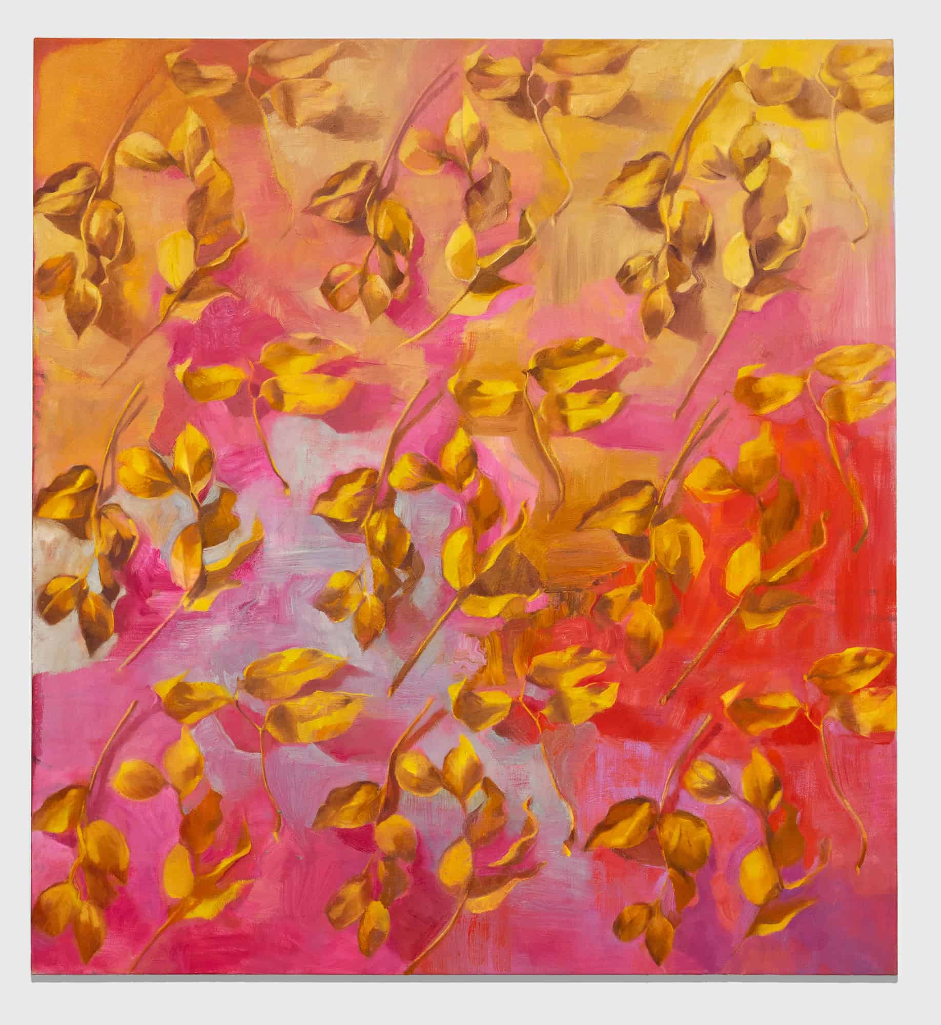 And that was when, and partially why, painting returned. Something chimed for Simms in considering the slow act of repetitive mark-making with paint and doing and experiencing those types of quotidian actions that had come to her heightened awareness. She’d been given a sense of the preciousness of living, and the uncanny but recuperative sense of going through our daily motions, and ambitiously wanted, simply, to paint that. Painting became a must again – painting an image, but in a manner that can be described as “abstract”, repeating a motif to the edge, all-over style while fusing figure and ground. The flora that she had been saving, embodying the powerful ideas and emotions she had experienced, became the subject, painted from life. The resulting paintings, made in luminous oil colour on supports of different scale, stand as quiet monuments to focus and realization, to sensitization and to healing.