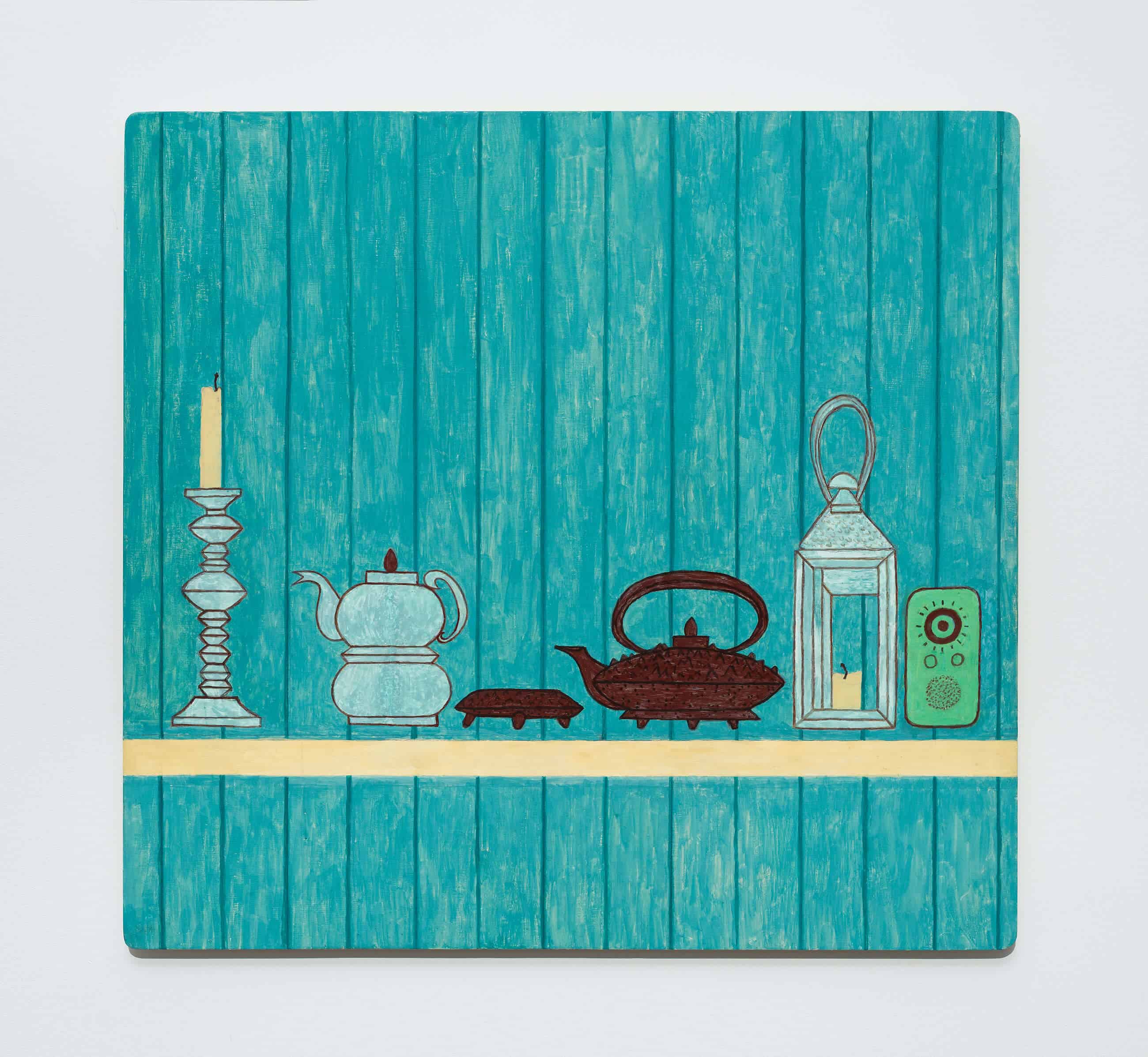 The composition is precise, the forms reduced to their essence, with colour playing a fundamental role: not to imitate real life, but to activate the pictorial space. This apparent simplicity is, in fact, highly complex. After drawing detailed studies in pencil and eraser, the artist retains only the lines necessary to the ensemble. Rejecting illusionistic perspective and cast shadows, Tessier favours a rigorous organisation of the picture plane to enhance its luminosity. Every hue, every line, every contour is meticulously considered, each one carefully calibrated to contribute to the overall visual harmony. The composition obeys a logic of subtle balance, where each element dialogues with the whole, without excess or redundancy. Through these interplays of resonances and glances, Tessier creates works that invites quiet contemplation, revealing their layered complexity and subtle sophistication.