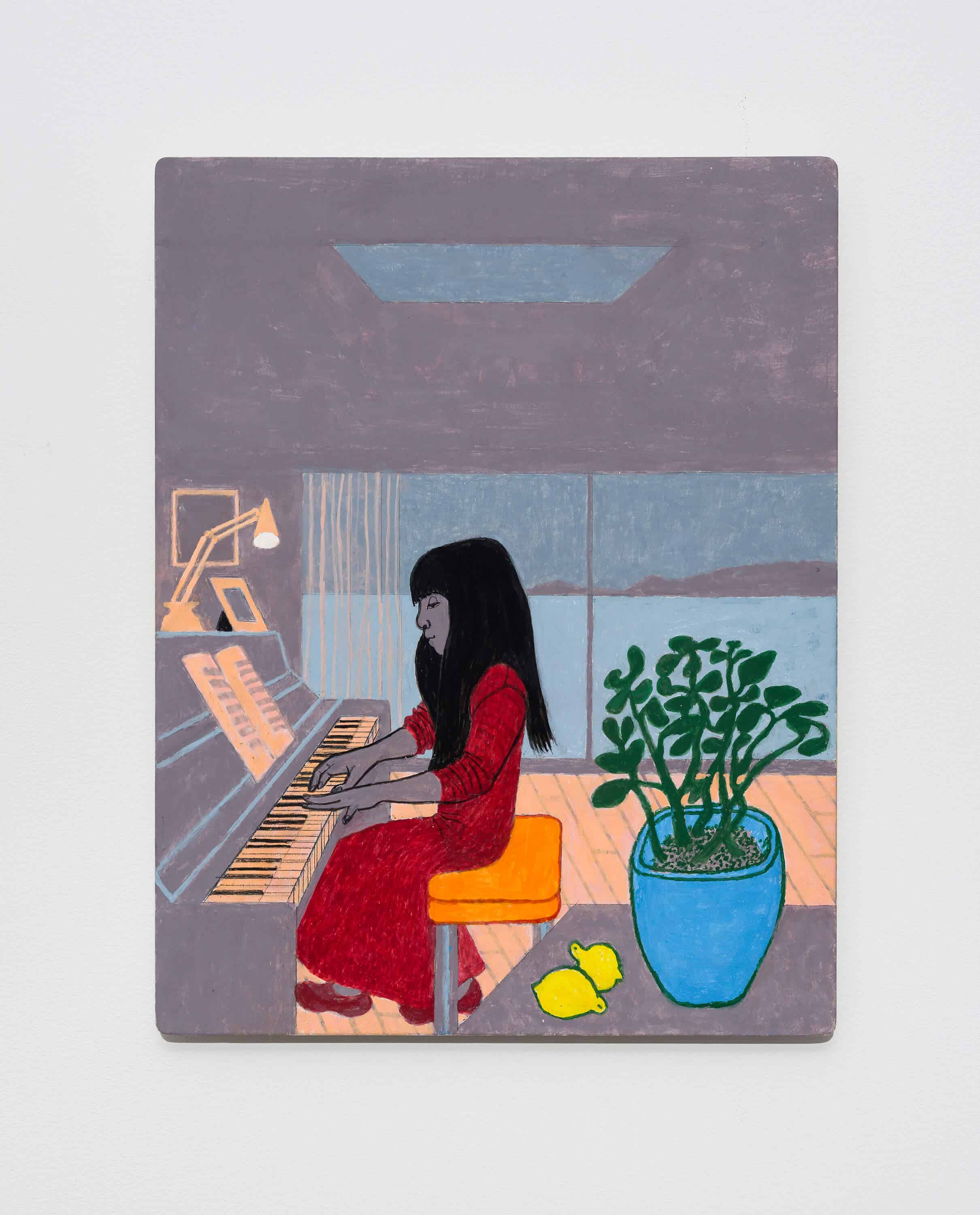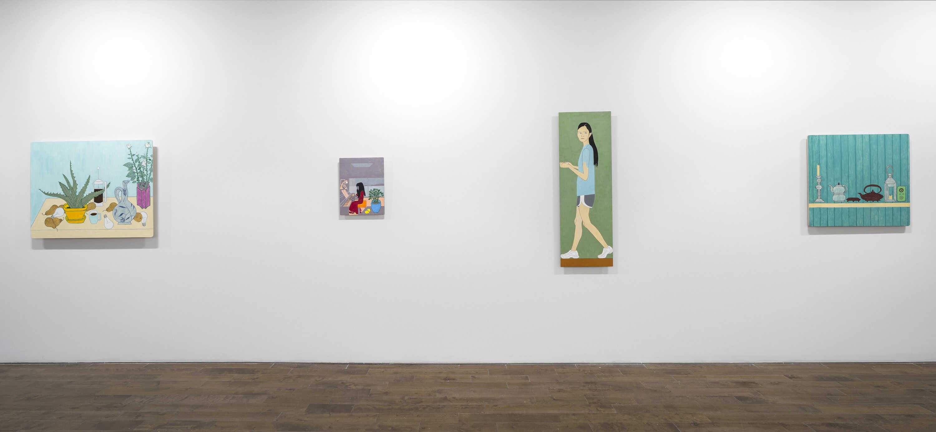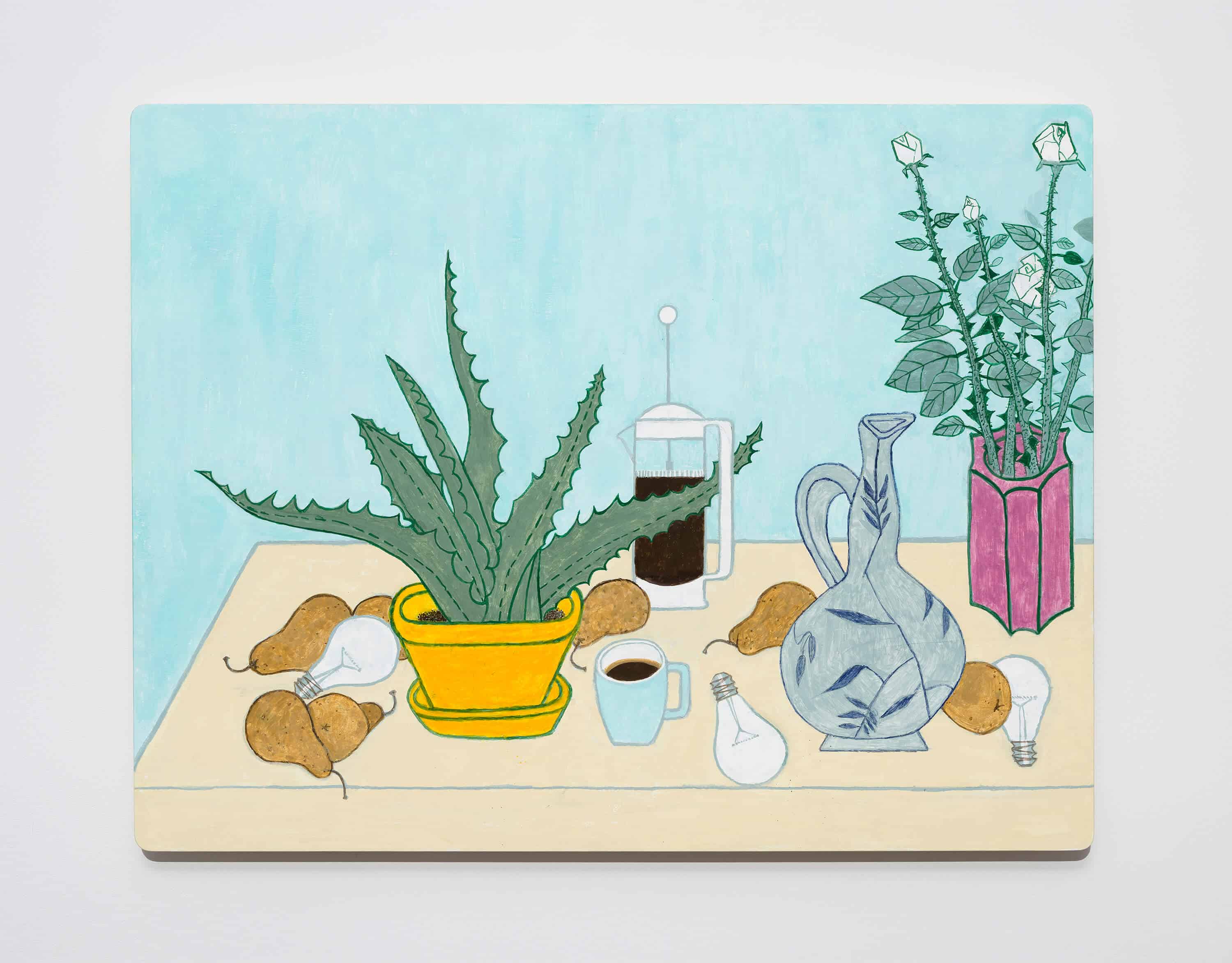 In this meticulously composed universe, objects meld into one another: a pear doubles up as a light bulb, an aloe leaf slips into the handle of a French press, while the reflection on a cocktail shaker is echoed in the silhouette of a straw. Some of the works feature human figures whose intense gaze reflects our own observation. A woman glances over her shoulder in a pictorial space so tight that her feet and hands skim the edges of the artwork, while elsewhere three figures face each other, engaged in a silent dialogue.