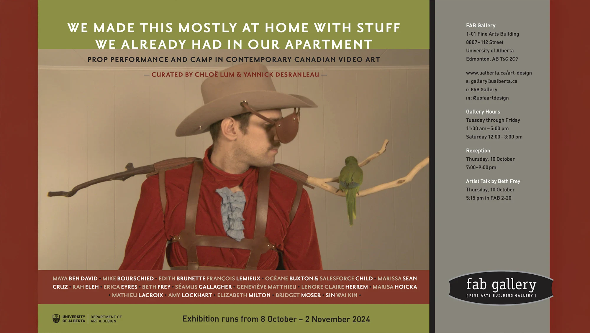 The gallery is pleased to announce that Mathieu Lacroix will present his work as part of a travelling group exhibition named We Made This Mostly at Home with Stuff We Already Had in Our Apartment: Prop Performance and Camp in Contemporary Canadian Video Art. Curated by Chloë Lum & Yannick Desranleau, the exhibit will be presented at the University of Alberta, AXENÉO7 (Gatineau) and Musée d’art de Joliette.