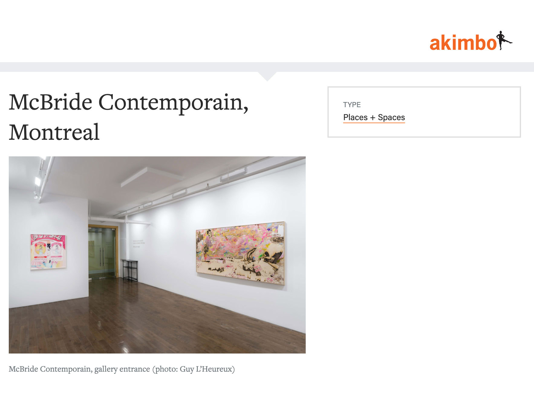 McBride Contemporain is pleased to be profiled in Akimblog’s Places + Spaces, a monthly series spotlighting distinctive exhibition venues across the Canadian art landscape. In this feature, gallery director Soad Carrier reflects on the gallery’s history in the Belgo Building, its curatorial vision, and the projects that lie ahead.
