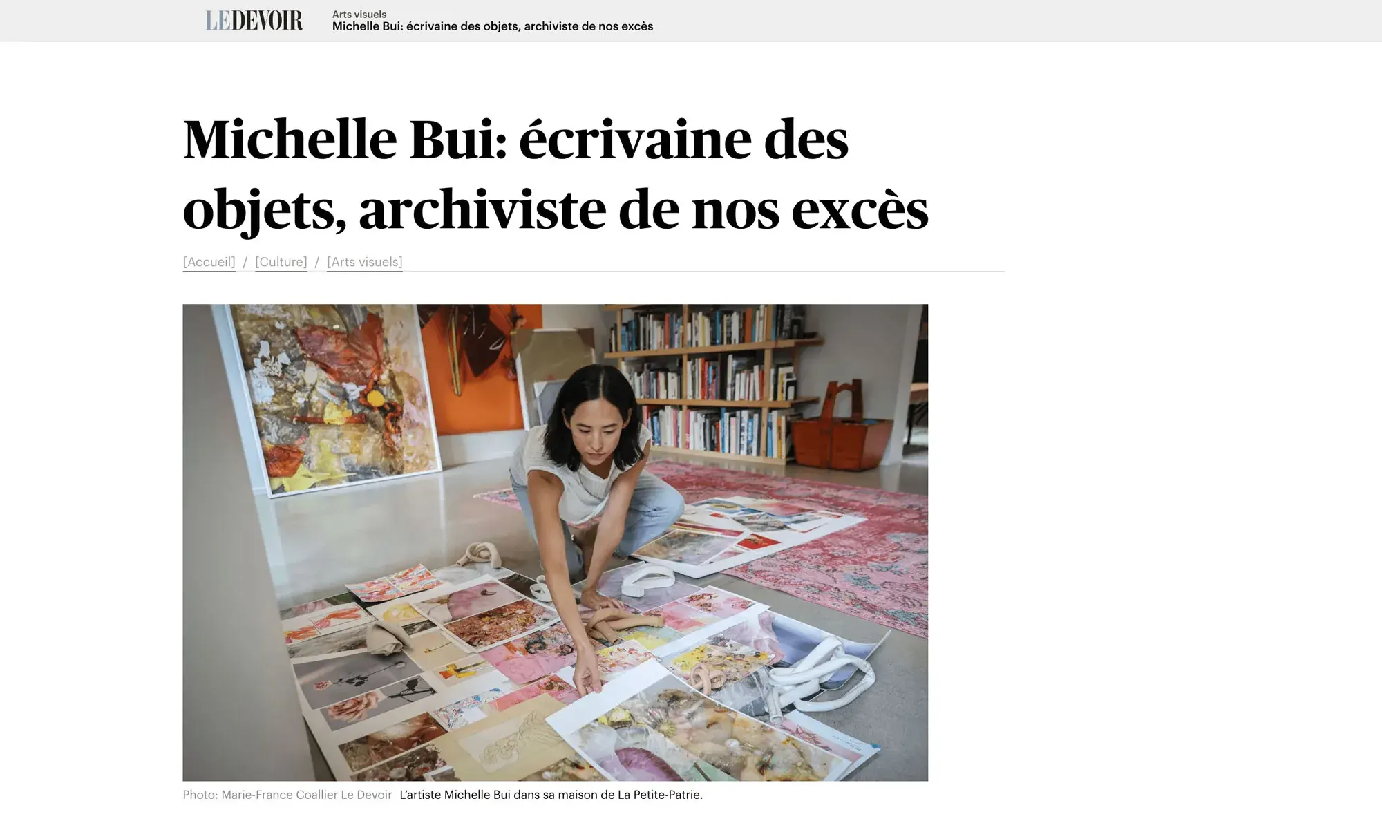 The gallery is pleased to share Olivier Du Ruisseau’s most recent article published in Le Devoir featuring Michelle Bui’s practice. In this piece, Olivier Du Ruisseau thoughtfully addresses themes of excess and archival practices in Michelle Bui’s work, focusing on how personal objects and archives can reflect broader cultural and historical narratives. The series examines the relationship between materiality and memory, questioning how we assign value to objects and what they reveal about our identities and histories.