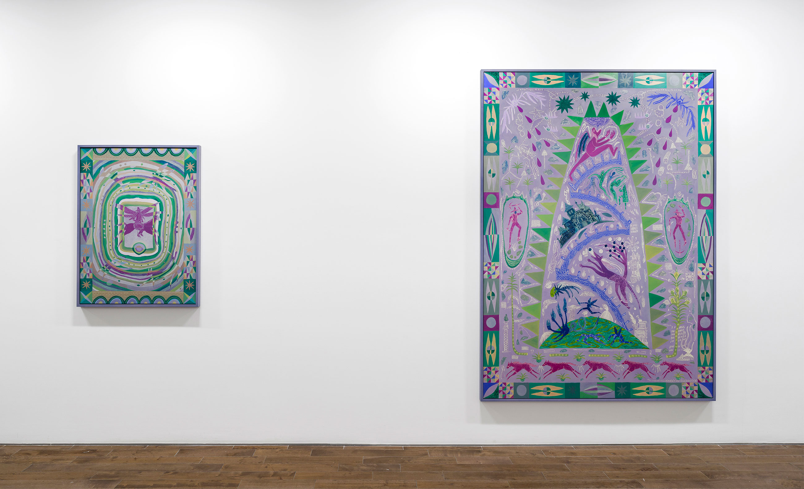 Rebecca Munce is an artist who explores the intersection of spiritual fantasy and the everyday psyche. By developing her own colour palettes as a system for visually describing new worlds, Munce traces lines in still-wet oil paint, using a reductive drawing technique that she has been rigorously exploring for several years. Each new work continues to build on these new universes that Munce has created, which further develops complex mythologies between humans and mythical creatures. The human archetypes she uses, such as the soldier or the explorer, are confronted with their own mortality in the face of the divine entities they encounter, reflecting a universal resonance with existential questions. Floral borders, iron fences and stone arenas function as compositional tools to contain these narratives, similar to protective magic circles or playgrounds. By continually evolving according to their own fantastical logic, these celestial spaces offer an engaging exploration of their own human condition.