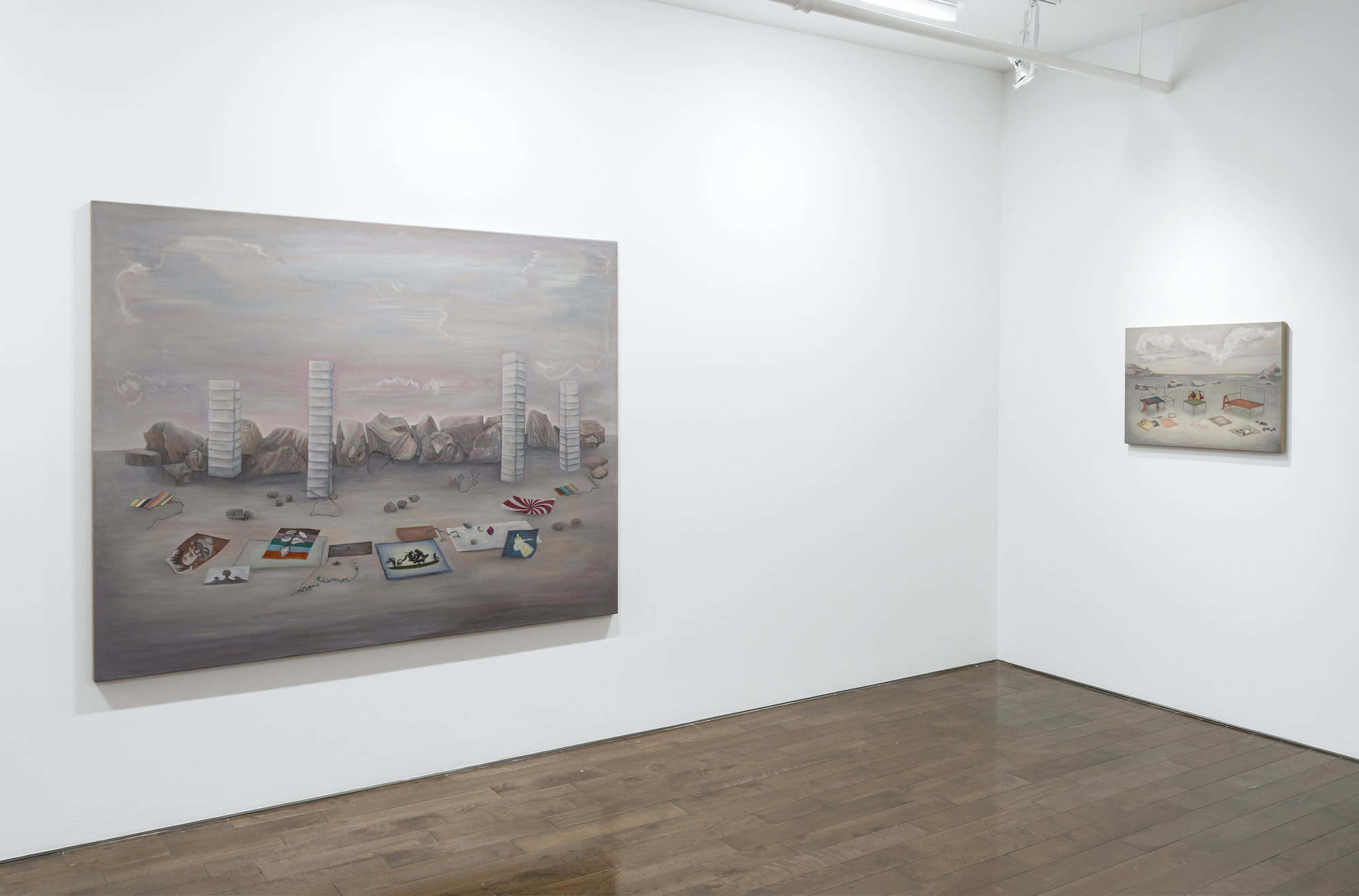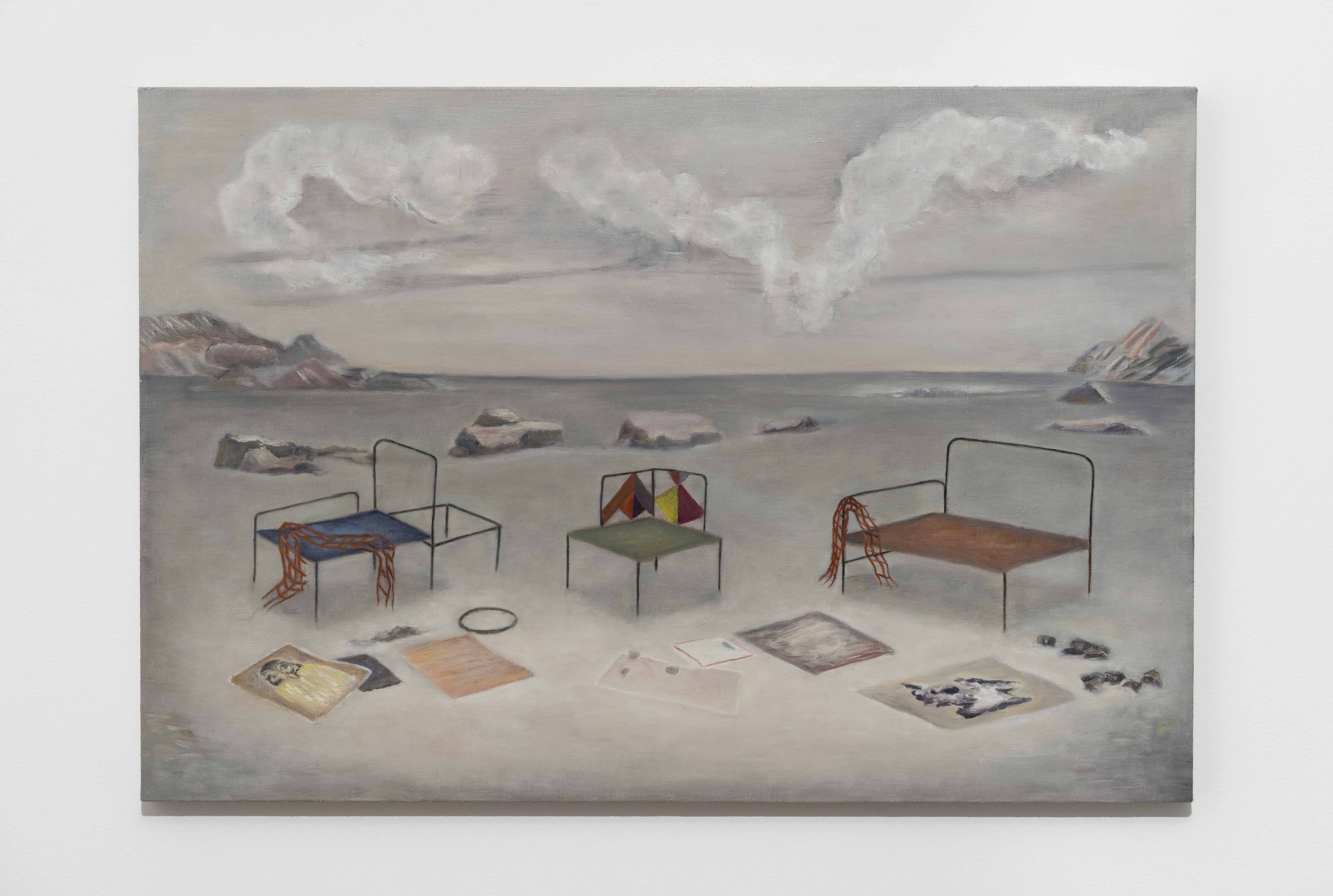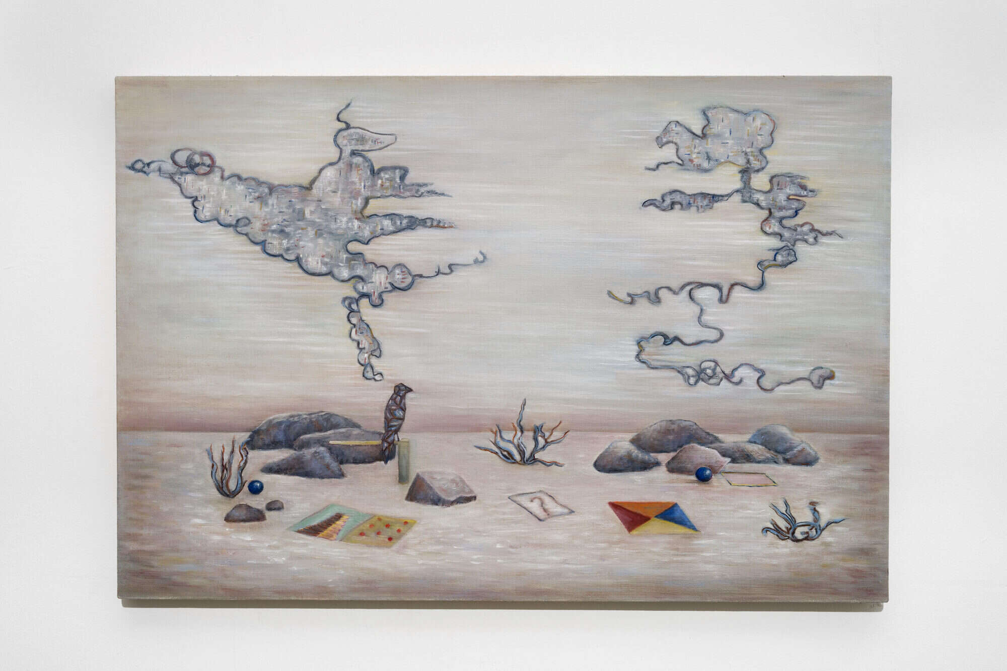 Sylvie Bouchard creates and explores an odd and fascinating world of dreamlike symbols and scenarios, in which characters, animals, objects and places gradually phase into existence. Her style draws as much on the western traditions of theatre and theatricality as it does on the fine art movements of symbolism, surrealism and new image painting. Her compositions depict a landscape that is a knowing projection of the faculty of imagination, in itself, beyond understanding and yet uncannily known. The things that seem to happen and to exist there are certainly related to classical archetypes and the contents of human subconsciousness. But a baffling and beautiful sense still retains its arbitrariness in these paintings, a resistance to explanation either by psychology or iconology. Bouchard deploys painterly effects slowly and coolly, mining a palette of chromatic greys, producing an imagery that slowly unfolds its loveliness as well as its more profound implications over time.