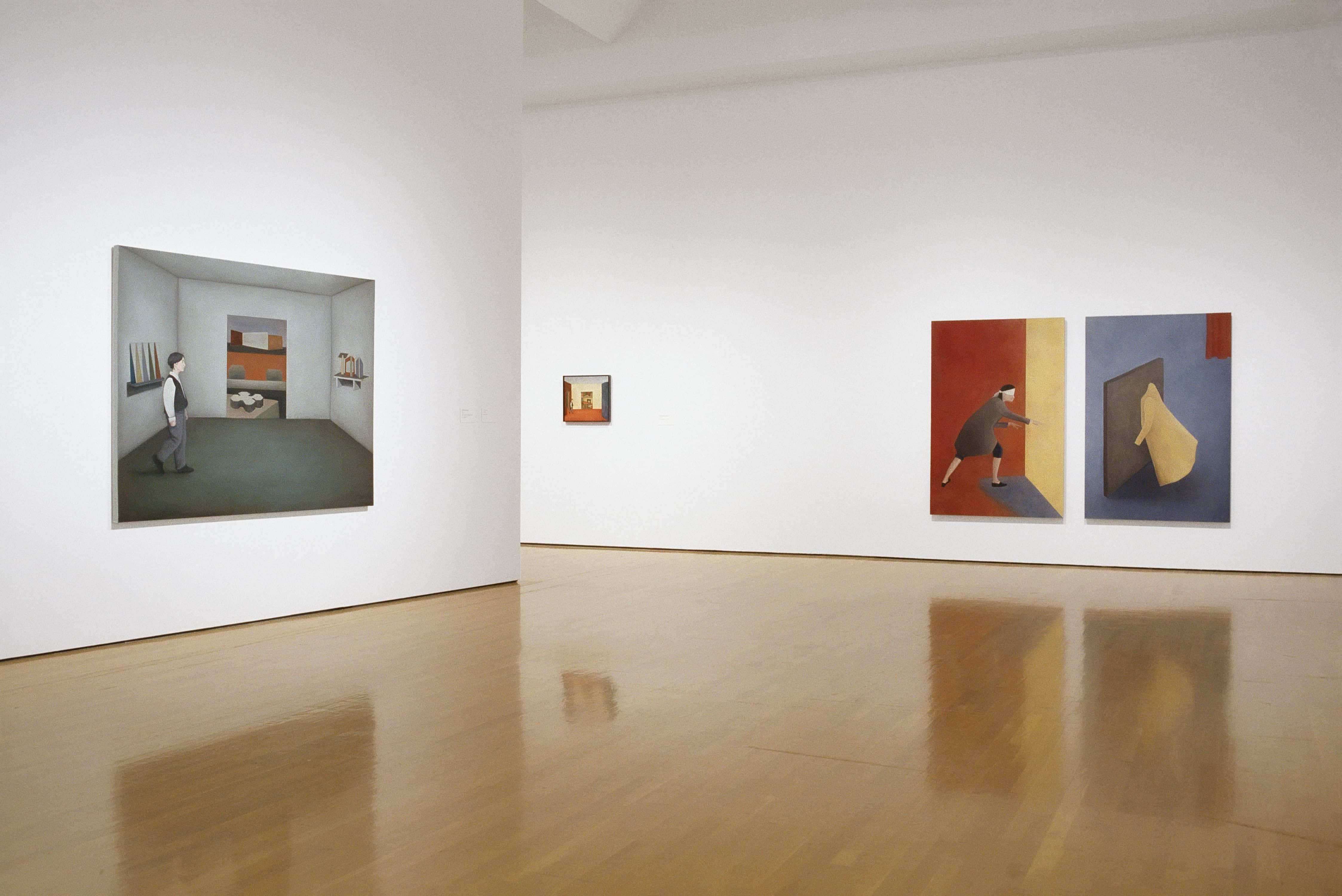 Sylvie Bouchard creates and explores an odd and fascinating world of dreamlike symbols and scenarios, in which characters, animals, objects and places gradually phase into existence. Her style draws as much on the western traditions of theatre and theatricality as it does on the fine art movements of symbolism, surrealism and new image painting. Her compositions depict a landscape that is a knowing projection of the faculty of imagination, in itself, beyond understanding and yet uncannily known. The things that seem to happen and to exist there are certainly related to classical archetypes and the contents of human subconsciousness. But a baffling and beautiful sense still retains its arbitrariness in these paintings, a resistance to explanation either by psychology or iconology. Bouchard deploys painterly effects slowly and coolly, mining a palette of chromatic greys, producing an imagery that slowly unfolds its loveliness as well as its more profound implications over time.